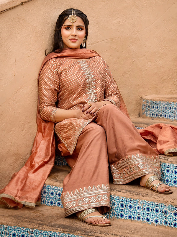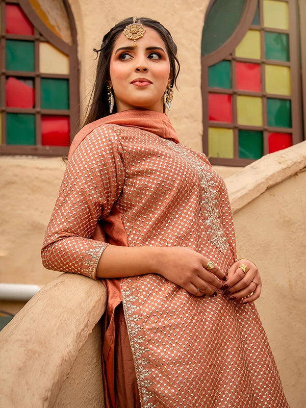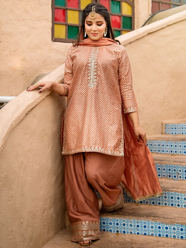 A luxurious festive ensemble featuring a full sequin-embroidered cotton shirt with intricate Zari work on the neckline, sleeves, and borders. Paired with an embroidered cotton silk farshi shalwar and a cotton net dupatta finished with Kiran lace, this look is perfect for making a regal statement.