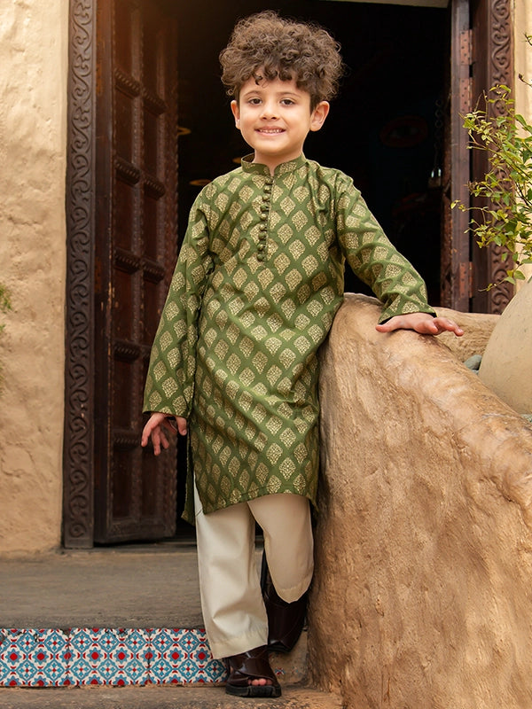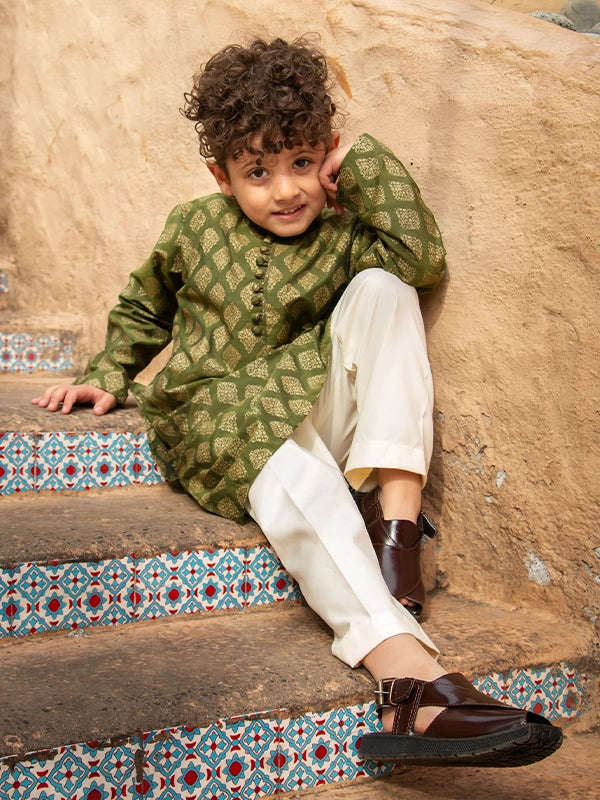 A refined and versatile Cotton Silk kurta set featuring a dull gold screen print on a lush green base, perfectly paired with an off-white pajama for a timeless festive or casual look.