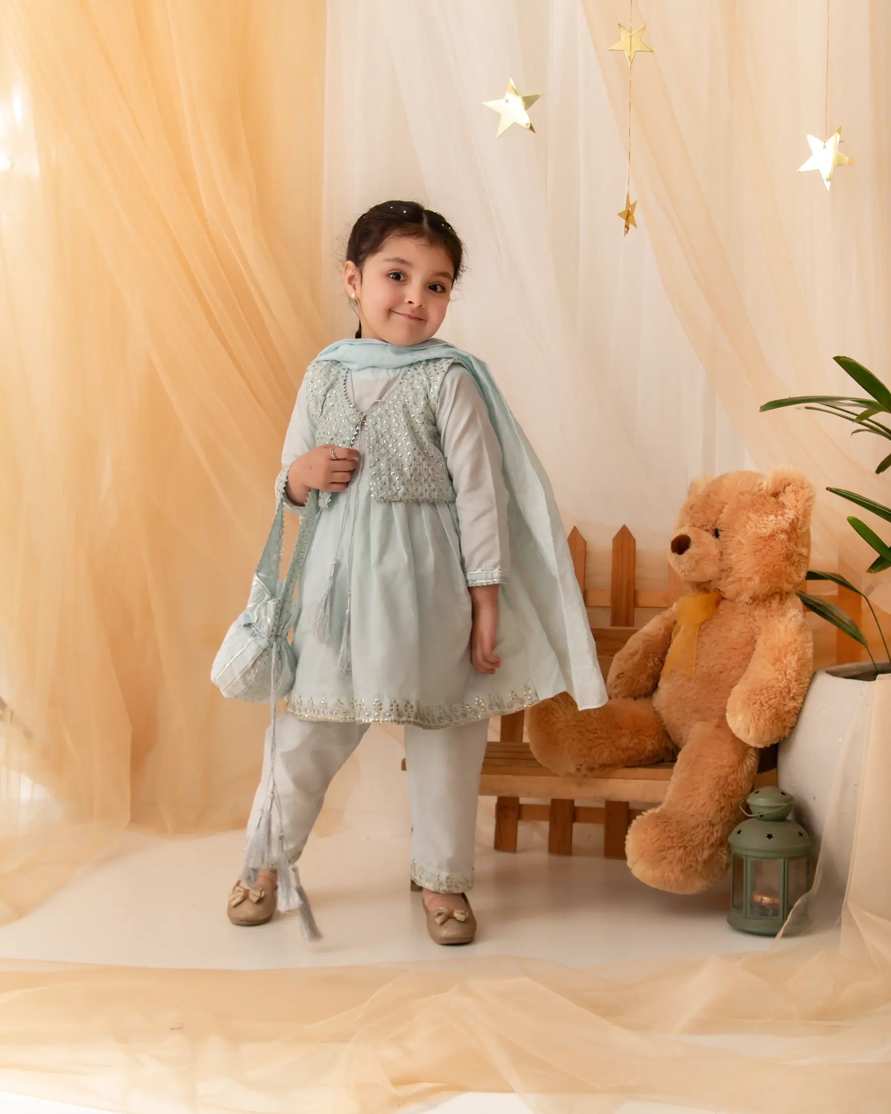 A regal festive ensemble featuring a cotton silk frock and trouser set accented with delicate Zari embroidery. The look is elevated by a statement waistcoat adorned with shimmering sequin work and completed with a matching organza dupatta, offering a sophisticated and layered silhouette for your grandest celebrations.