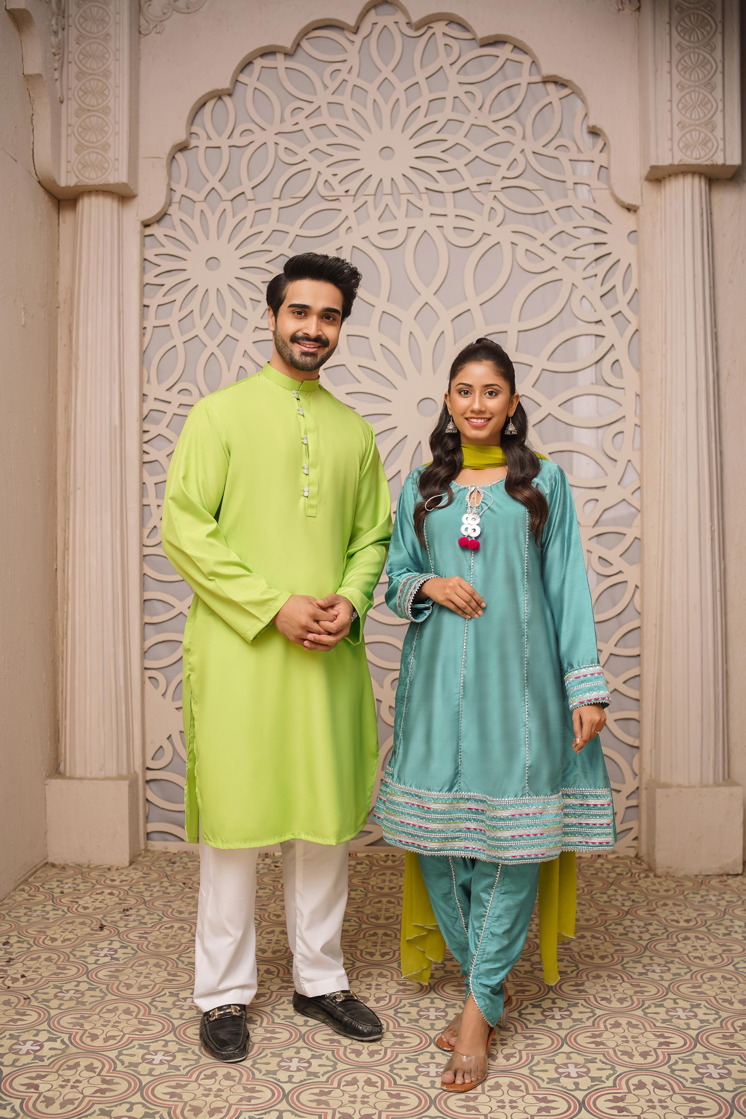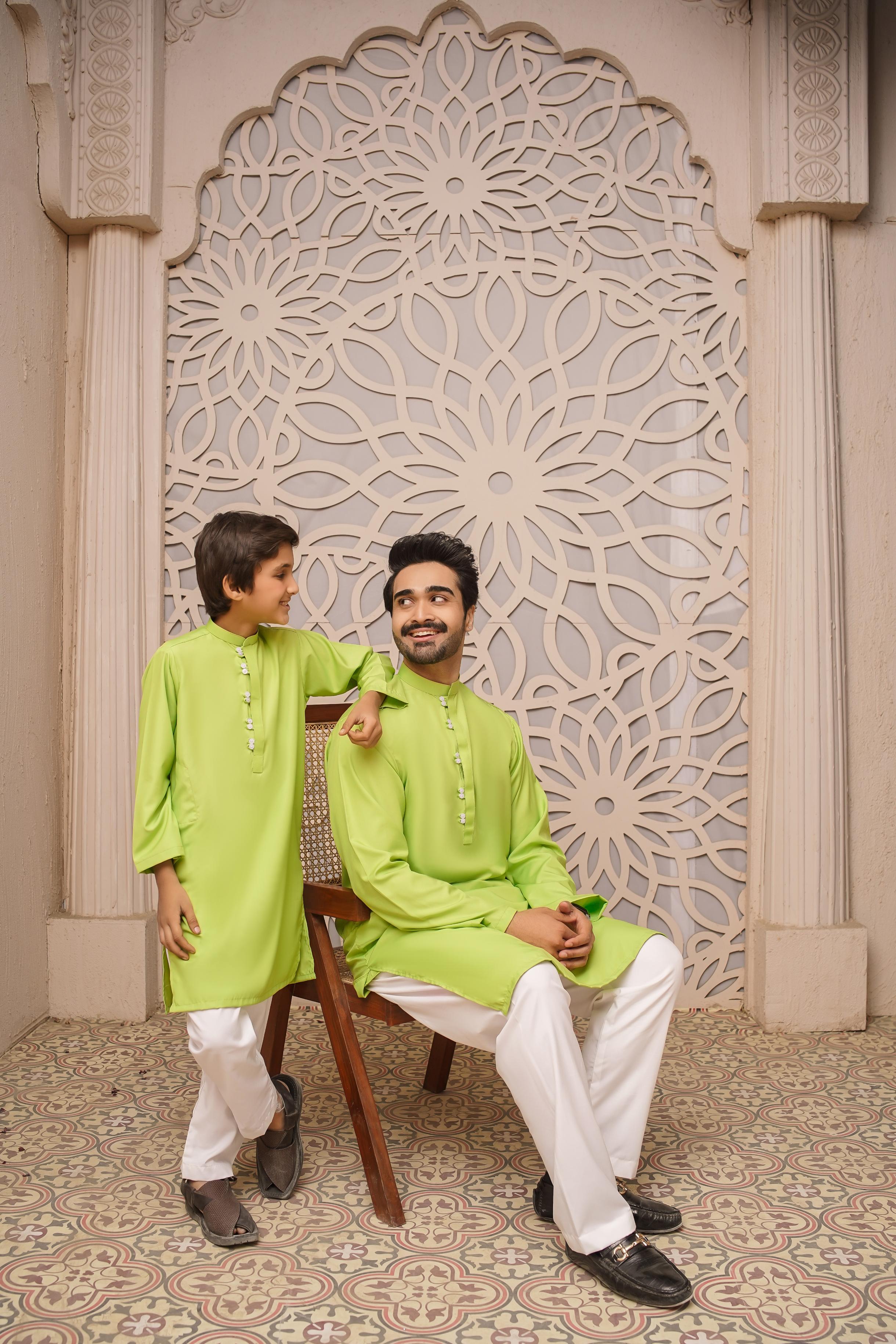 Make dressing up effortless with this apple green kurta pajama set. Crafted from soft, wash-and-wear fabric, the kurta boasts button detailing for a polished look, while the matching pajama keeps it classic.