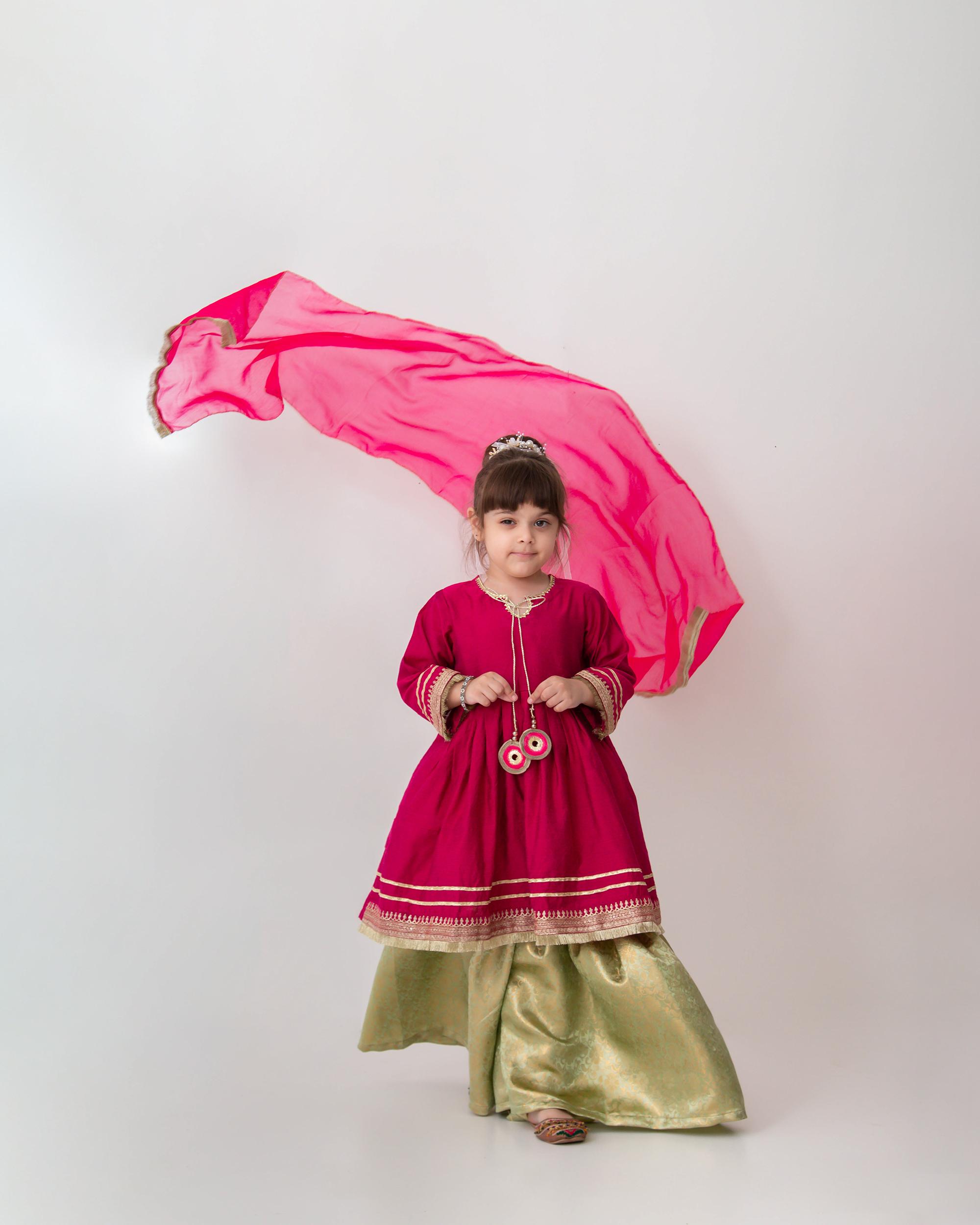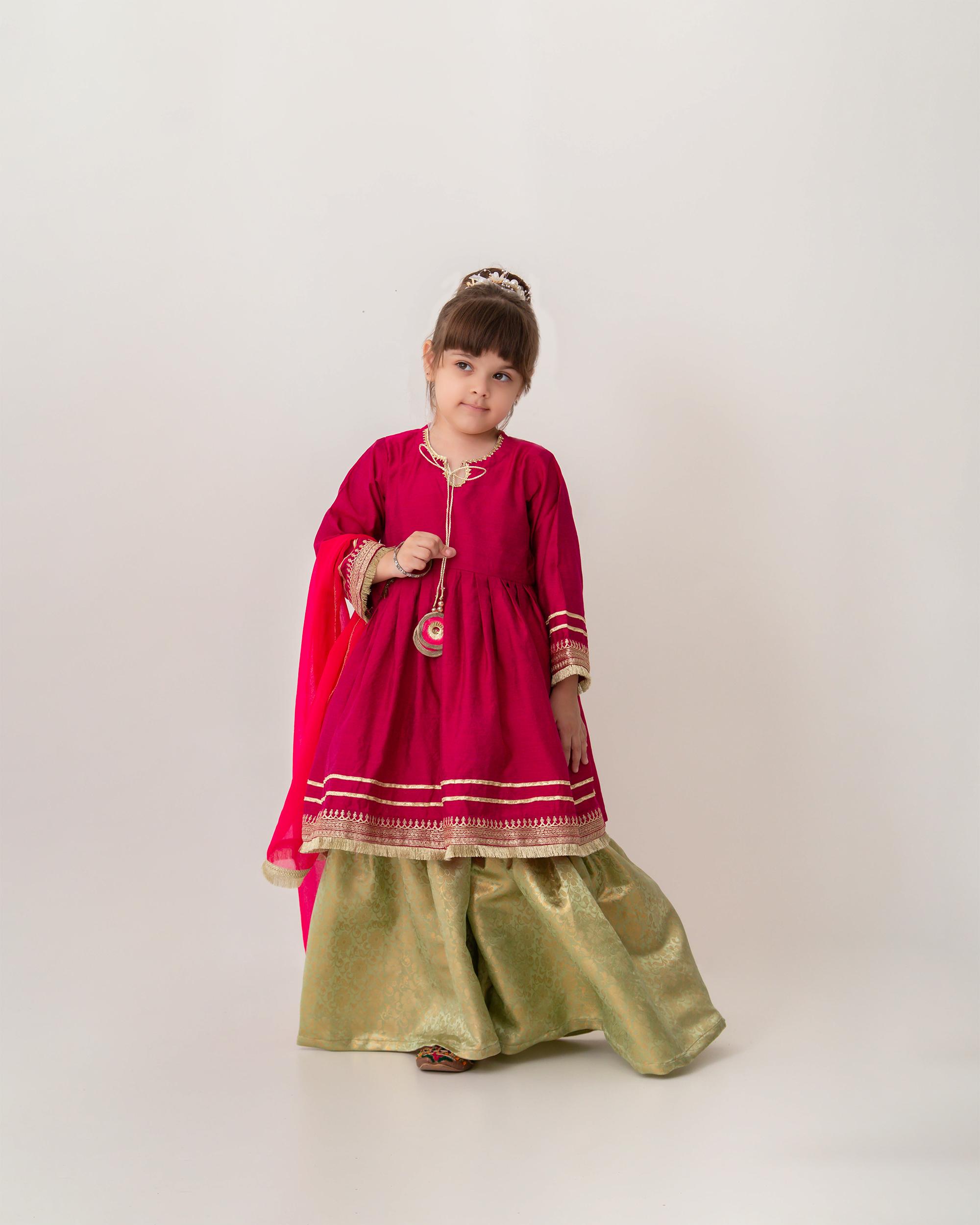Let her shine in this sweet and stylish three-piece set. The pink cotton silk shirt glows with zari embroidery, lace embellishments, and dainty tassels, while the mint atlas banarsi gharara adds traditional charm. Topped off with a chiffon dupatta trimmed in kiran, this outfit features gota lace and handcrafted tassels, making it perfect for year-round celebrations.
