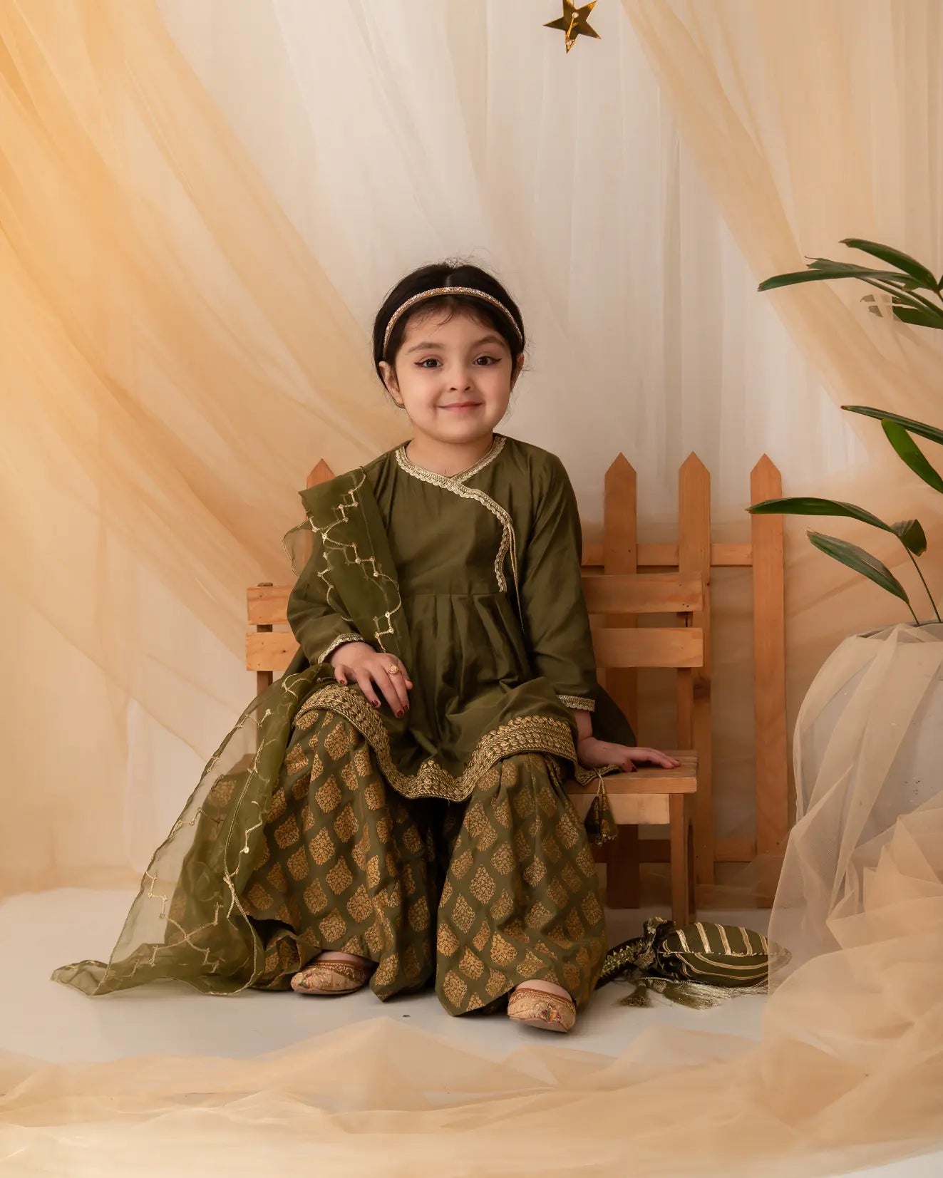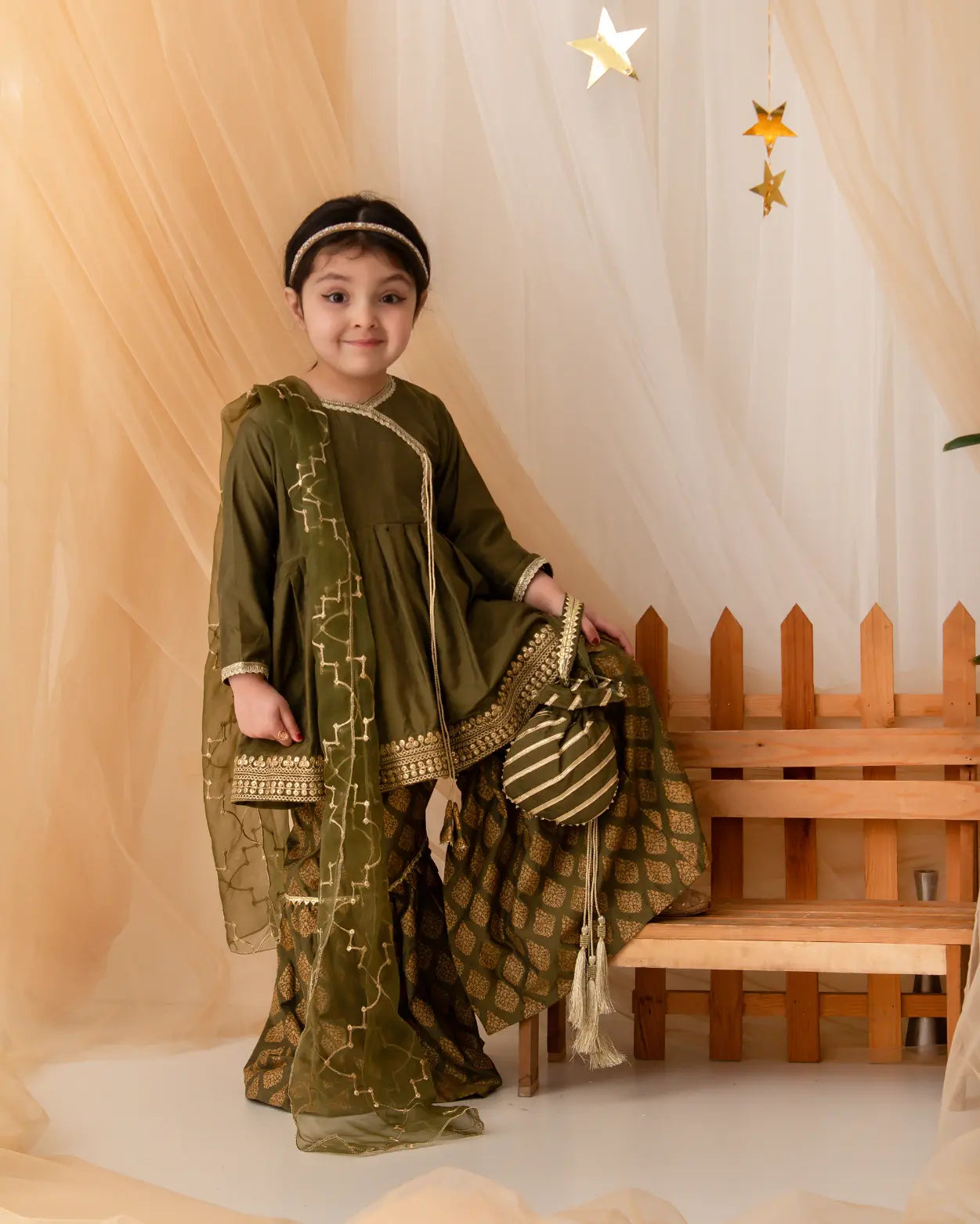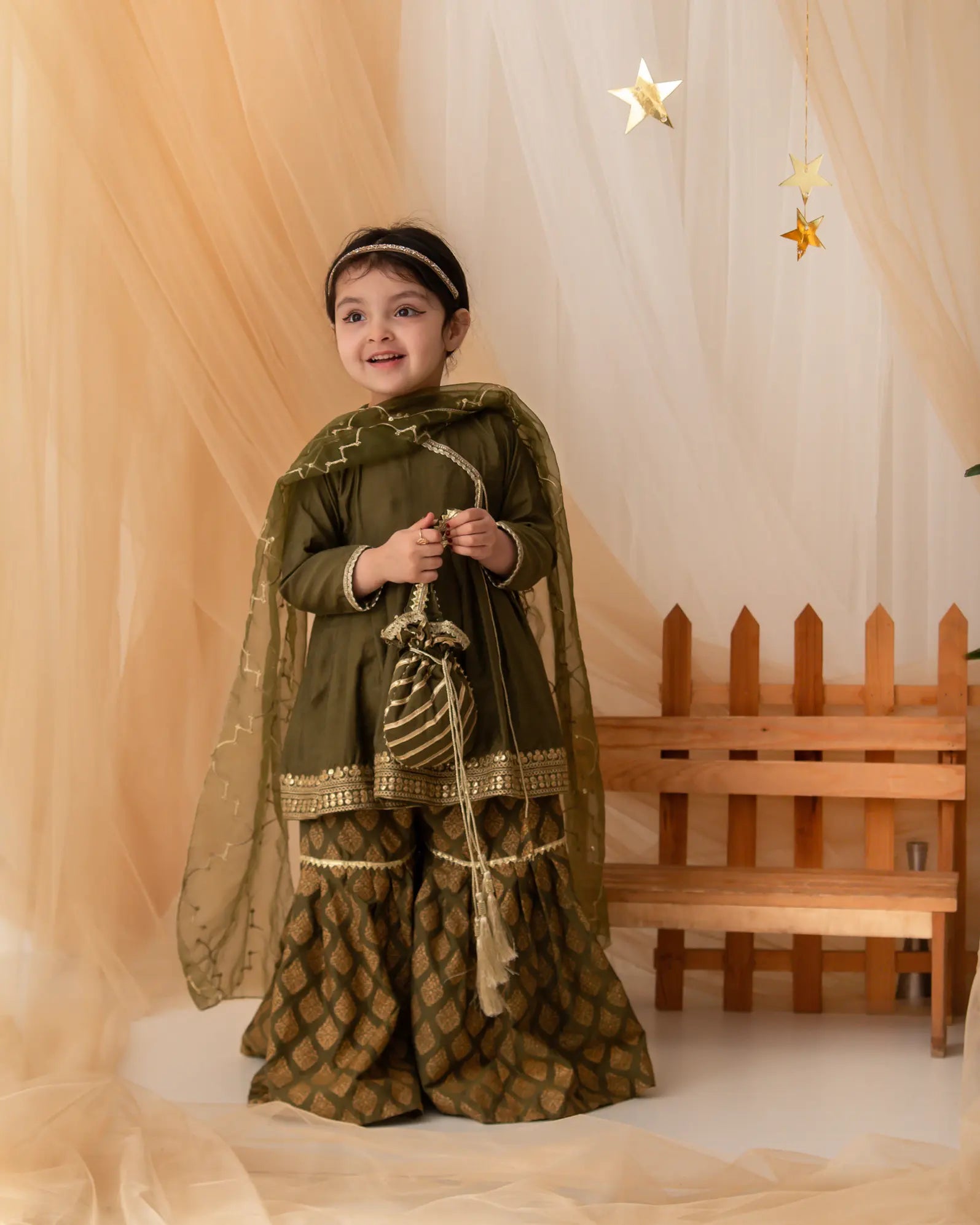 A whimsical festive set featuring a cotton net peplum enriched with intricate Zari and sequin embroidery. Paired with a statement screen-printed gharara and a detailed organza dupatta, this ensemble offers a perfect blend of artisanal craft and graceful volume for any special occasion.
