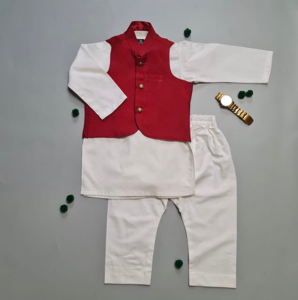 This 3-piece set is perfect for your little one's stylish wardrobe. The sleek black wash-and-wear kurta pajama offers easy comfort, while the maroon cotton silk waistcoat adds a bold pop of color, making it a fun and dapper outfit for special days.