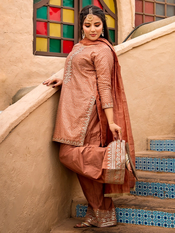 A luxurious festive ensemble featuring a full sequin-embroidered cotton shirt with intricate Zari work on the neckline, sleeves, and borders. Paired with an embroidered cotton silk farshi shalwar and a cotton net dupatta finished with Kiran lace, this look is perfect for making a regal statement.