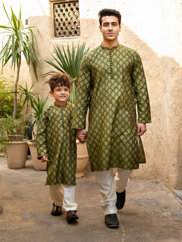A refined and versatile Cotton Silk kurta set featuring a dull gold screen print on a lush green base, perfectly paired with an off-white pajama for a timeless festive or casual look.