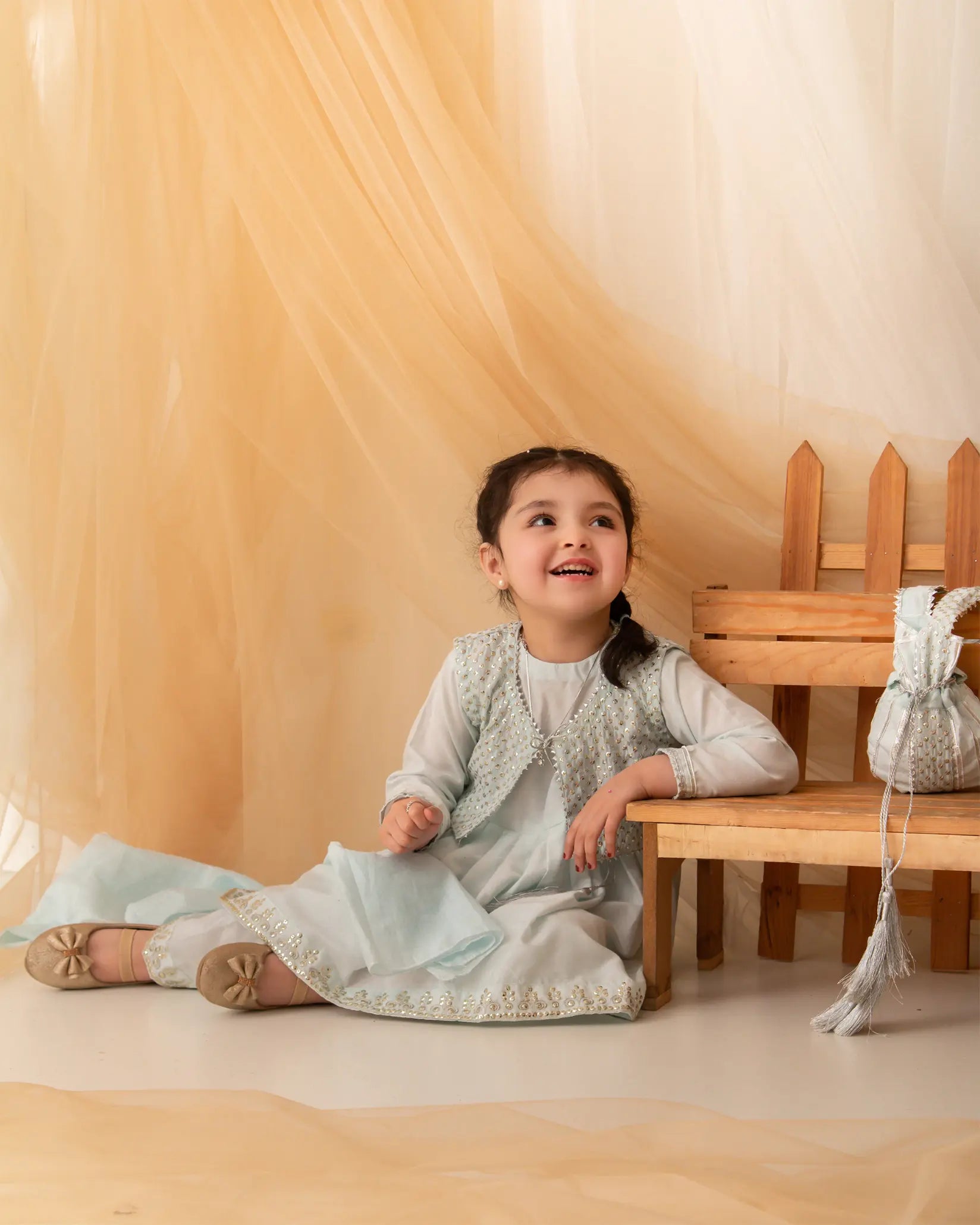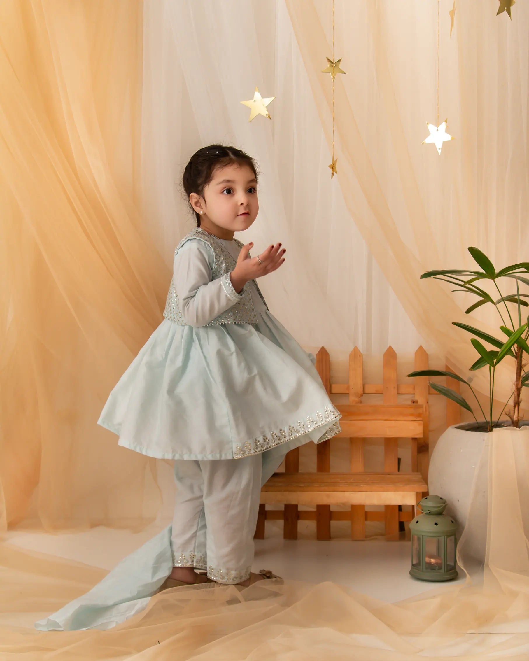 A regal festive ensemble featuring a cotton silk frock and trouser set accented with delicate Zari embroidery. The look is elevated by a statement waistcoat adorned with shimmering sequin work and completed with a matching organza dupatta, offering a sophisticated and layered silhouette for your grandest celebrations.