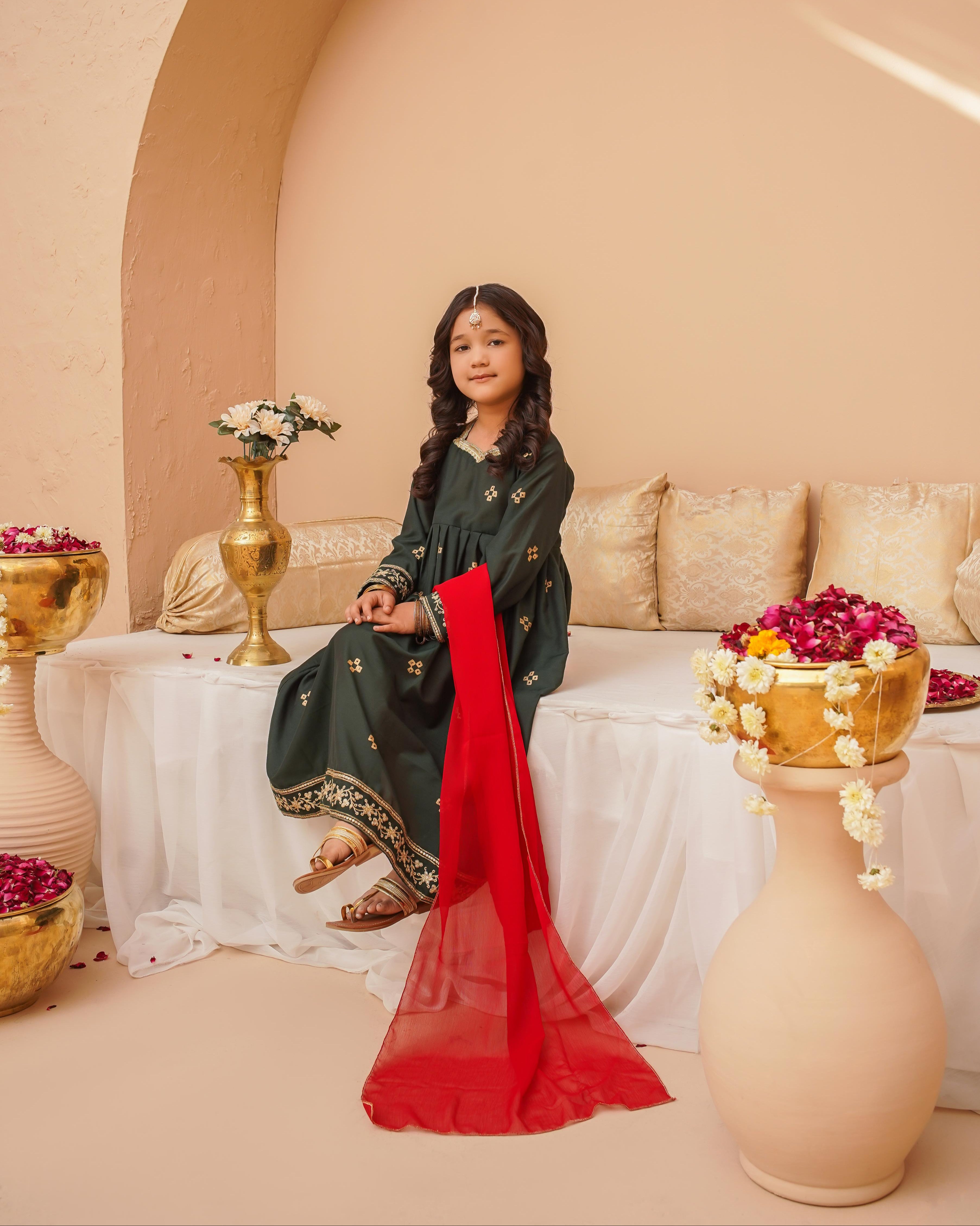 A stunning emerald green cotton silk ensemble for little girls, featuring delicate block print and Zarri-sequins embroidery on the sleeves and daman. Paired with a plain trouser and a vibrant red chiffon dupatta, this outfit is ideal for festive flair!