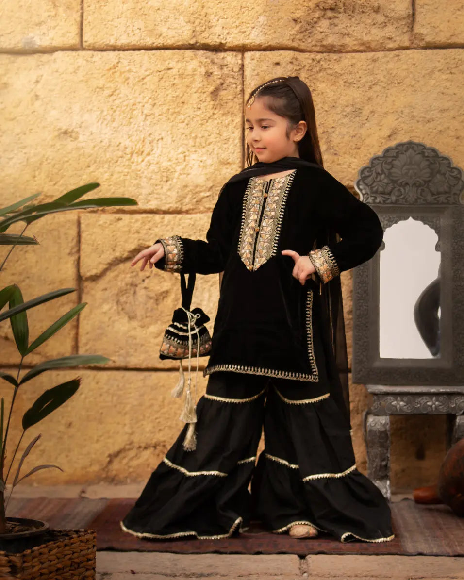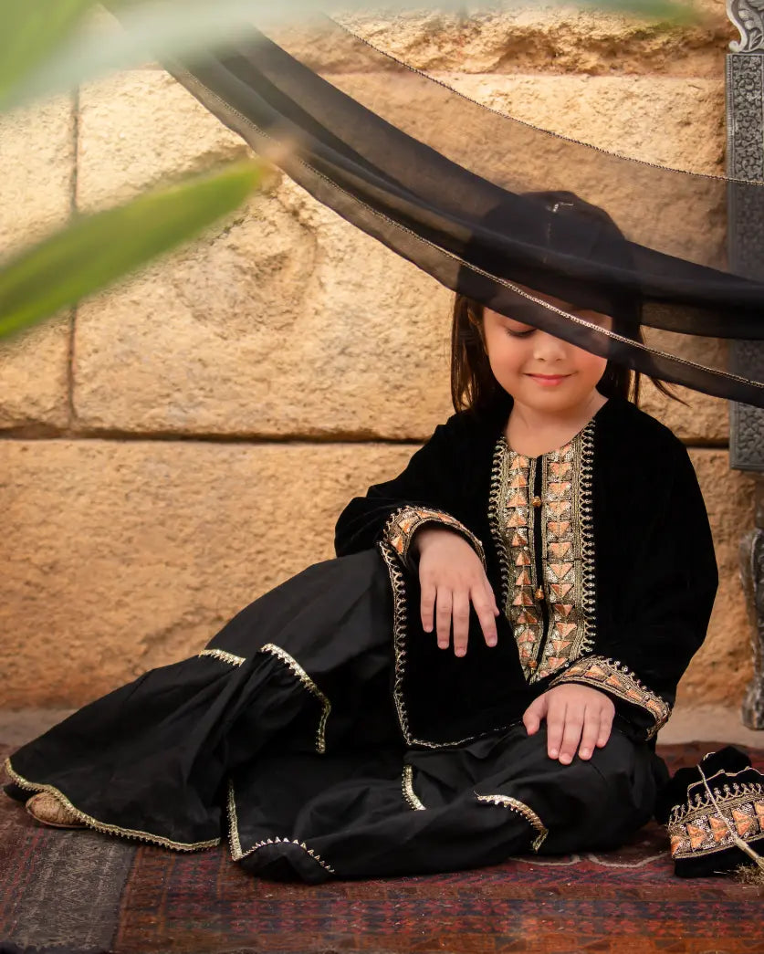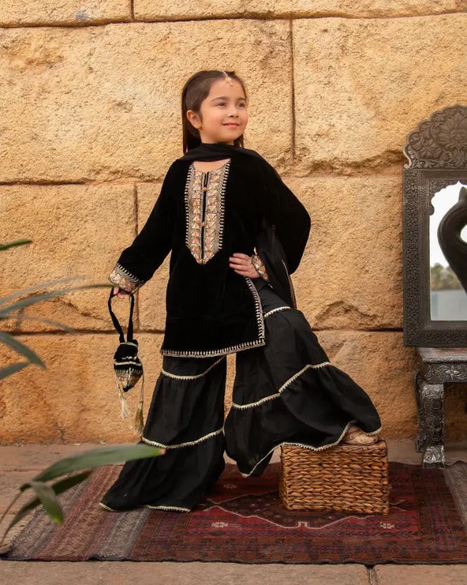 Crafted in rich velvet and flowing cotton silk, this festive ensemble is elevated with intricate resham, zari, and sequin embroidery and delicate lace accents. The Gota Kiran-edged dupatta adds a regal touch, making it perfect for graceful twirls and refined celebrations. A luxurious choice for timeless festive elegance.