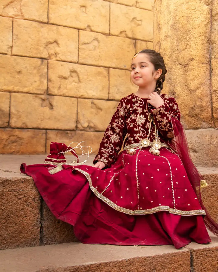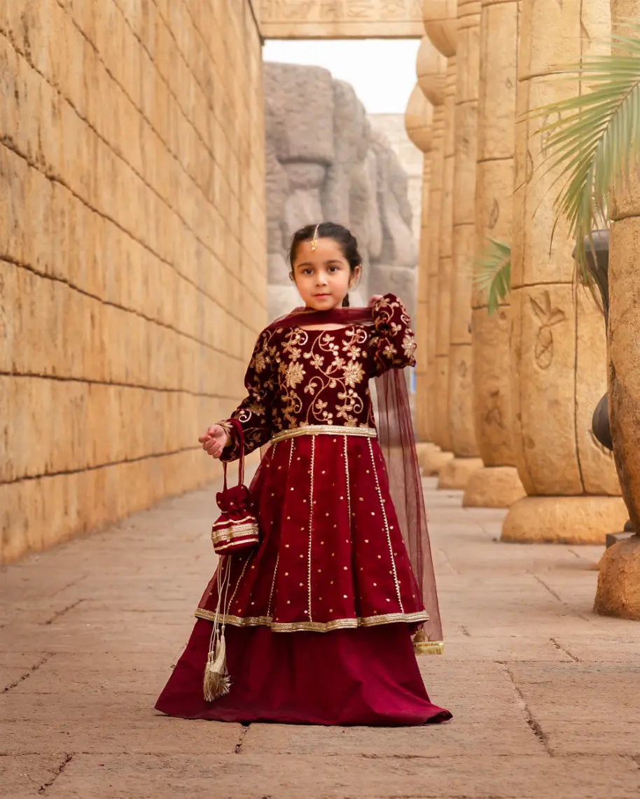 This 3-piece festive ensemble combines a rich velvet embroidered bodice frock with a flowing cotton silk lehenga and cotton net gharara, offering both comfort and elegance. The premium zari and sequin embroidery adds festive sparkle, while the soft net dupatta completes the luxurious look—perfect for twirls, celebrations, and timeless festive charm.