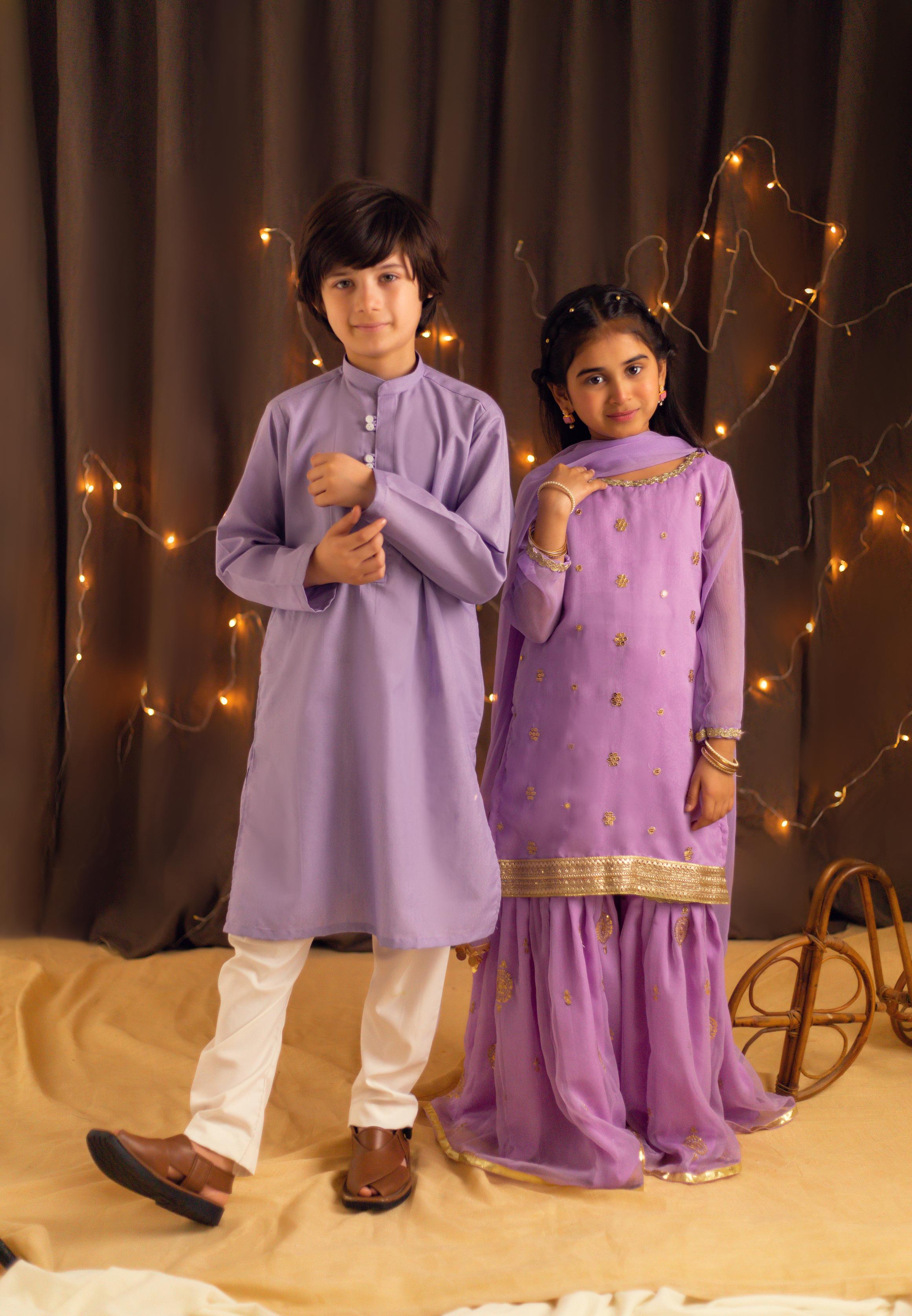 This lovely lilac wash-and-wear kurta with button detailing is paired with a clean white pajama for a fresh, stylish look. Lightweight and easy to wear, this outfit is perfect for keeping your little one comfortable while looking effortlessly charming.