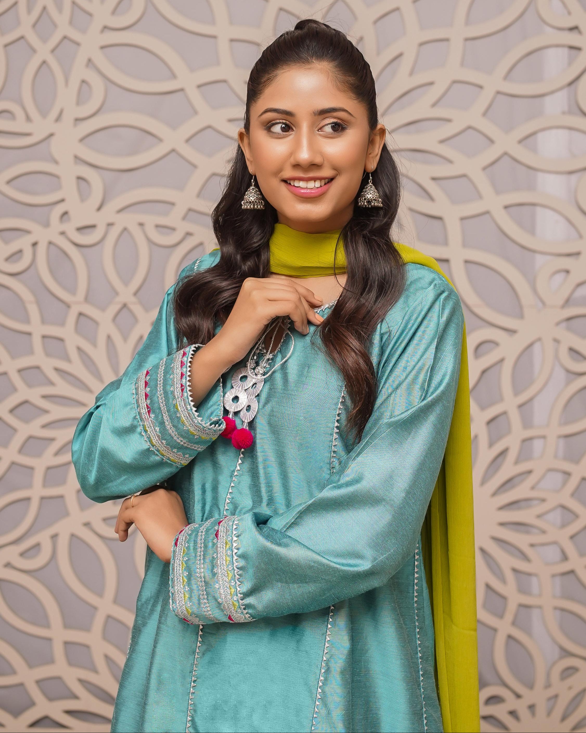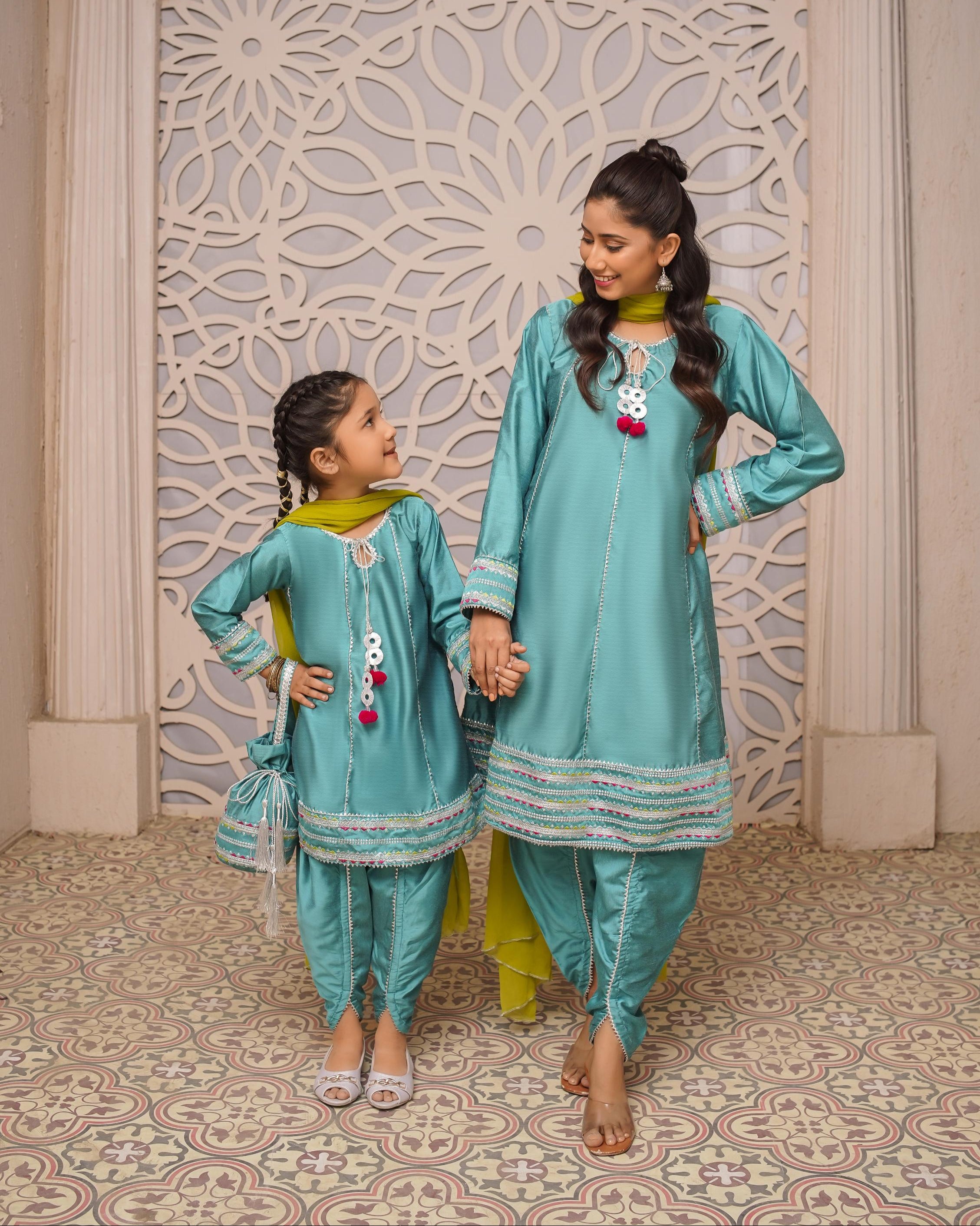 Paired with stylish dhoti pants, accentuated by intricate lace detailing, this outfit effortlessly blends tradition with modern flair. Completing the look is a lightweight chiffon dupatta.