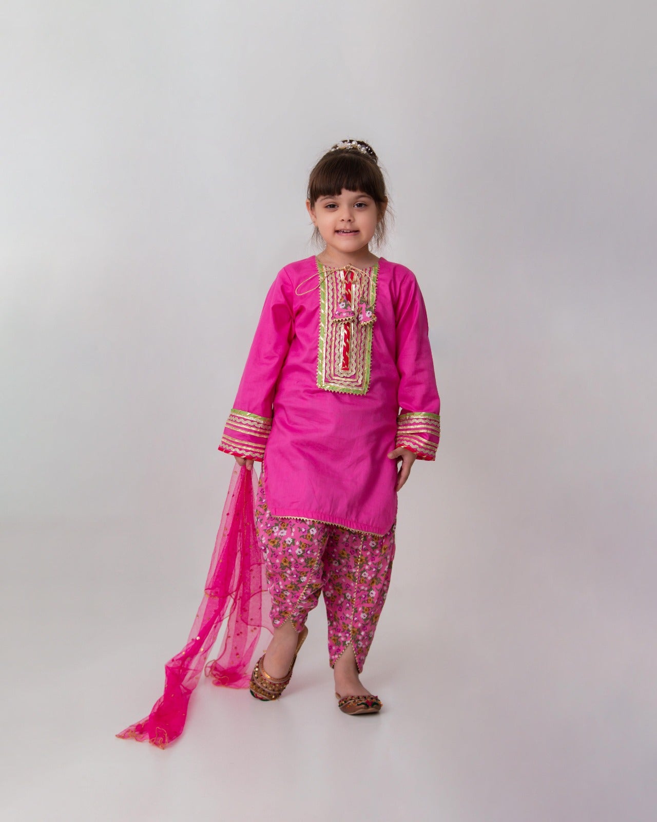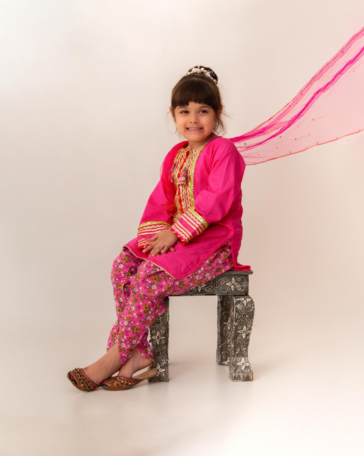 Let your little one shine in this summer-ready outfit crafted from breathable cotton lawn. The classic shirt and printed tulip pants offer a fun twist on tradition, while gota lace and handmade tassels add intricate flair. A chiffon dupatta completes the look—lightweight and perfect for every cheerful occasion.